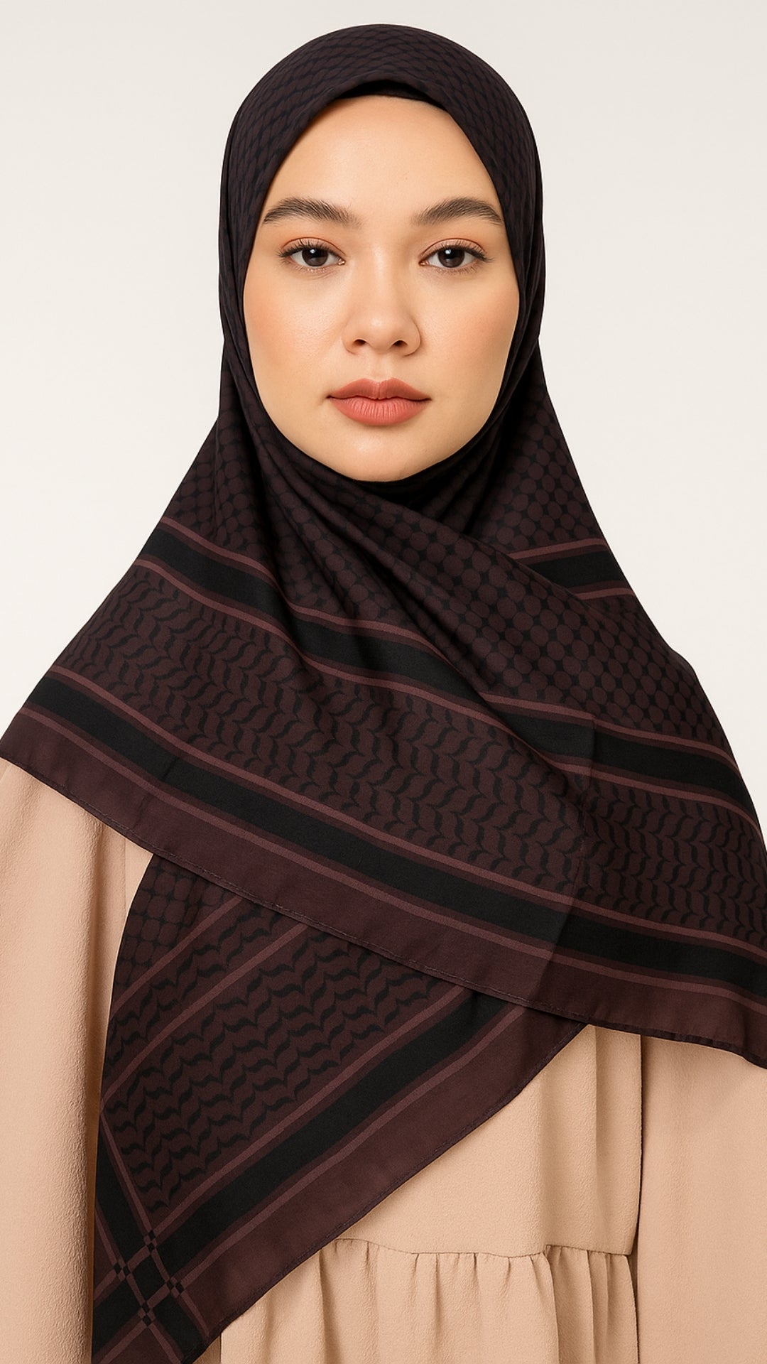 The Keffiyeh-inspired print celebrates tradition with a modern sensibility featuring intricate geometric motifs symbolizing unity, resilience, and identity. The rhythmic lines and micro-patterns are carefully balanced to enhance symmetry and visual harmony, while the earthy tones offer understated sophistication that complements any wardrobe.