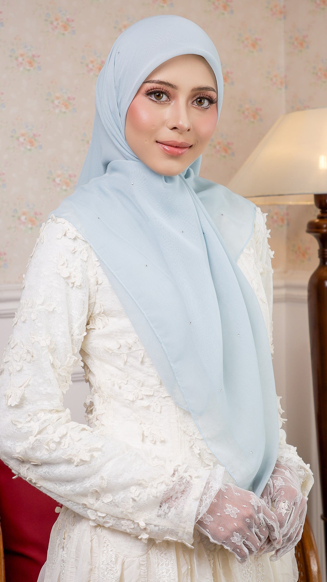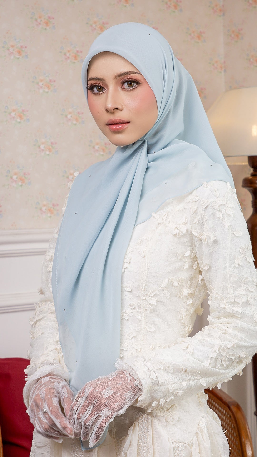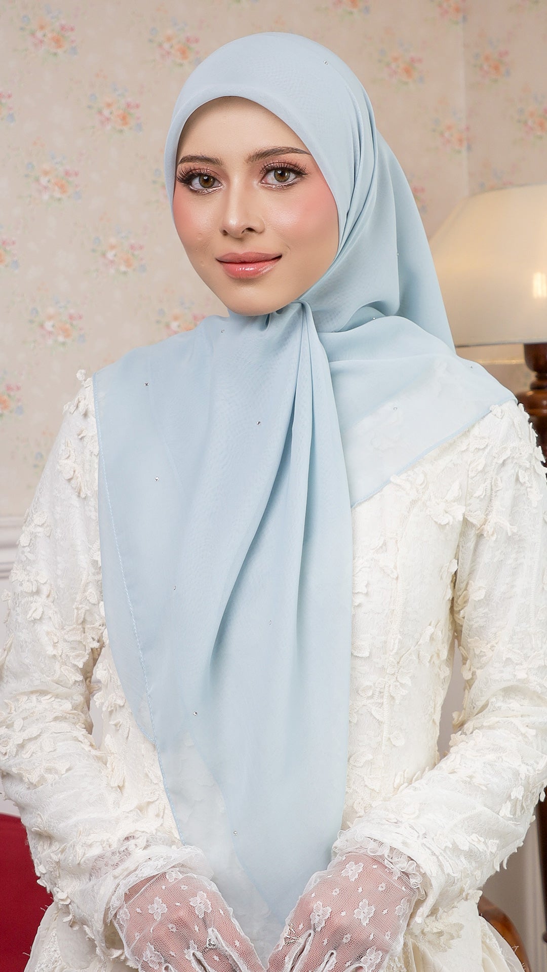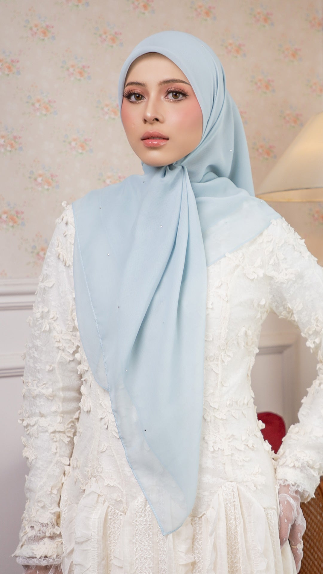 The Sofia Bawal represents a refined approach to contemporary hijab styling. This 45 x 45 inch square combines Japanese Voile a breathable, lightweight fabric prized for its fluid drape with authentic Swarovski crystals for subtle luminosity. With a 7/10 opacity rating, it delivers substantial coverage without compromising comfort or visibility.