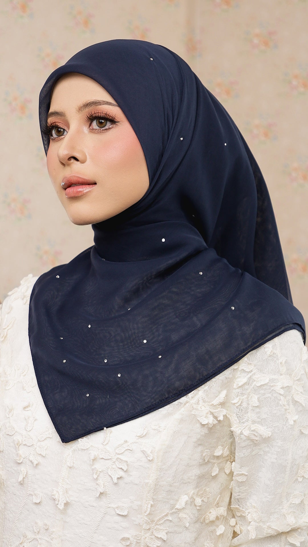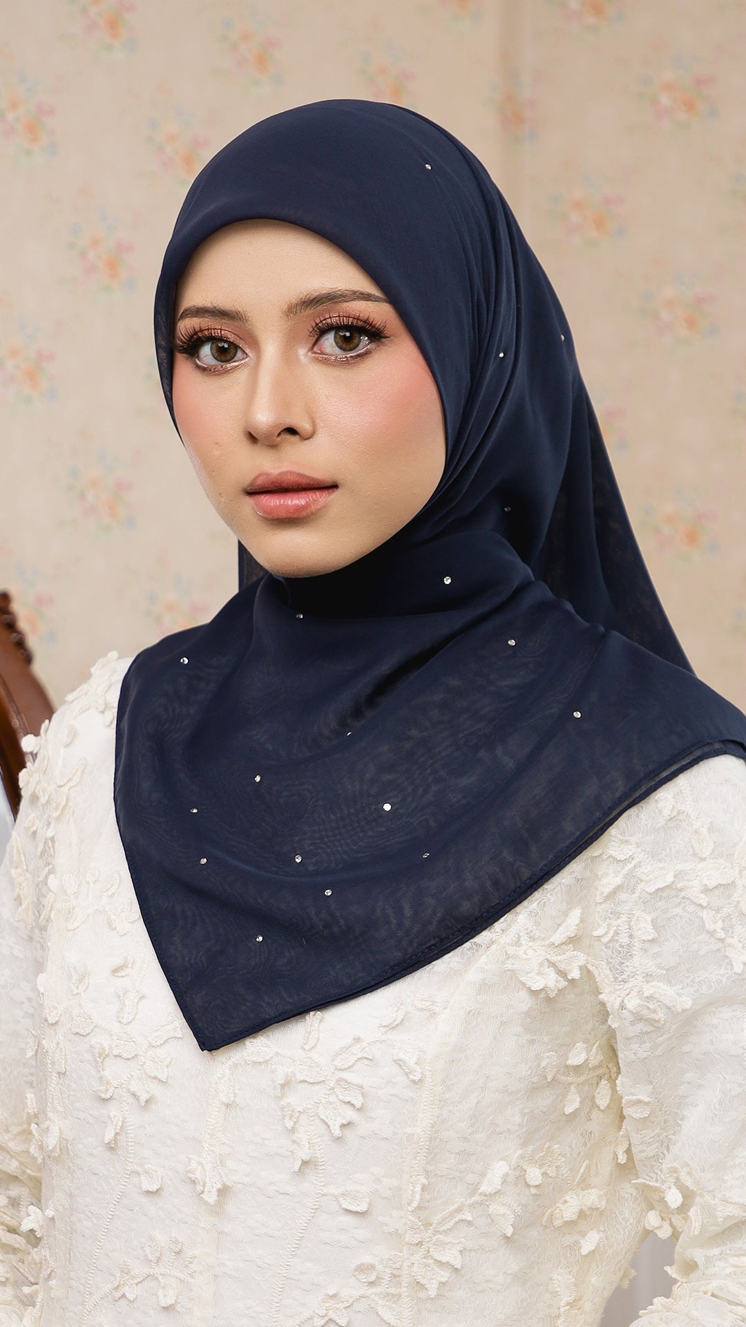 The Sofia Bawal represents a refined approach to contemporary hijab styling. This 45 x 45 inch square combines Japanese Voile a breathable, lightweight fabric prized for its fluid drape with authentic Swarovski crystals for subtle luminosity. With a 7/10 opacity rating, it delivers substantial coverage without compromising comfort or visibility.