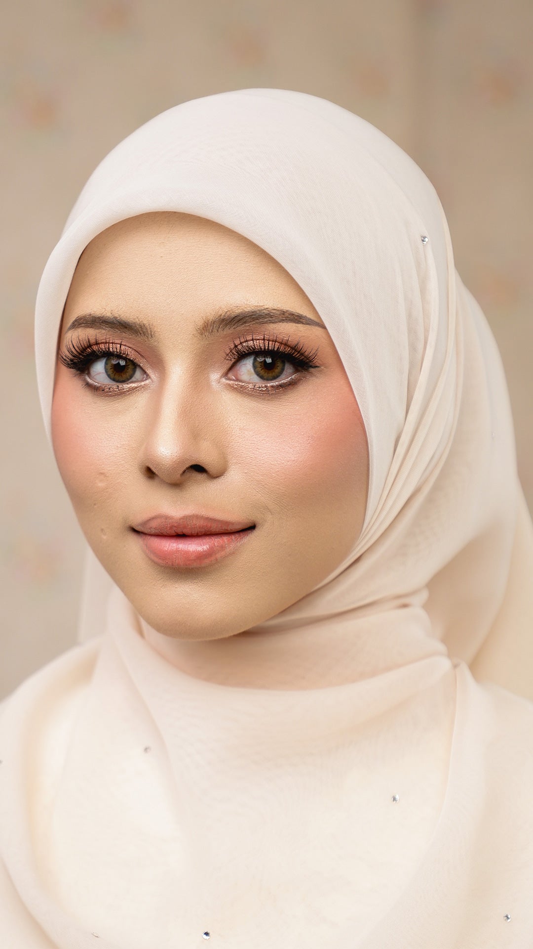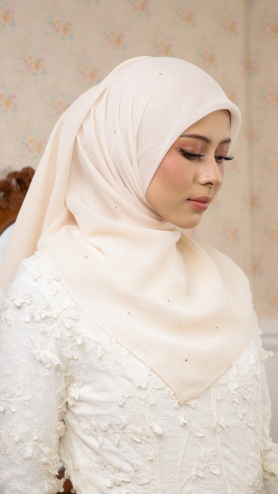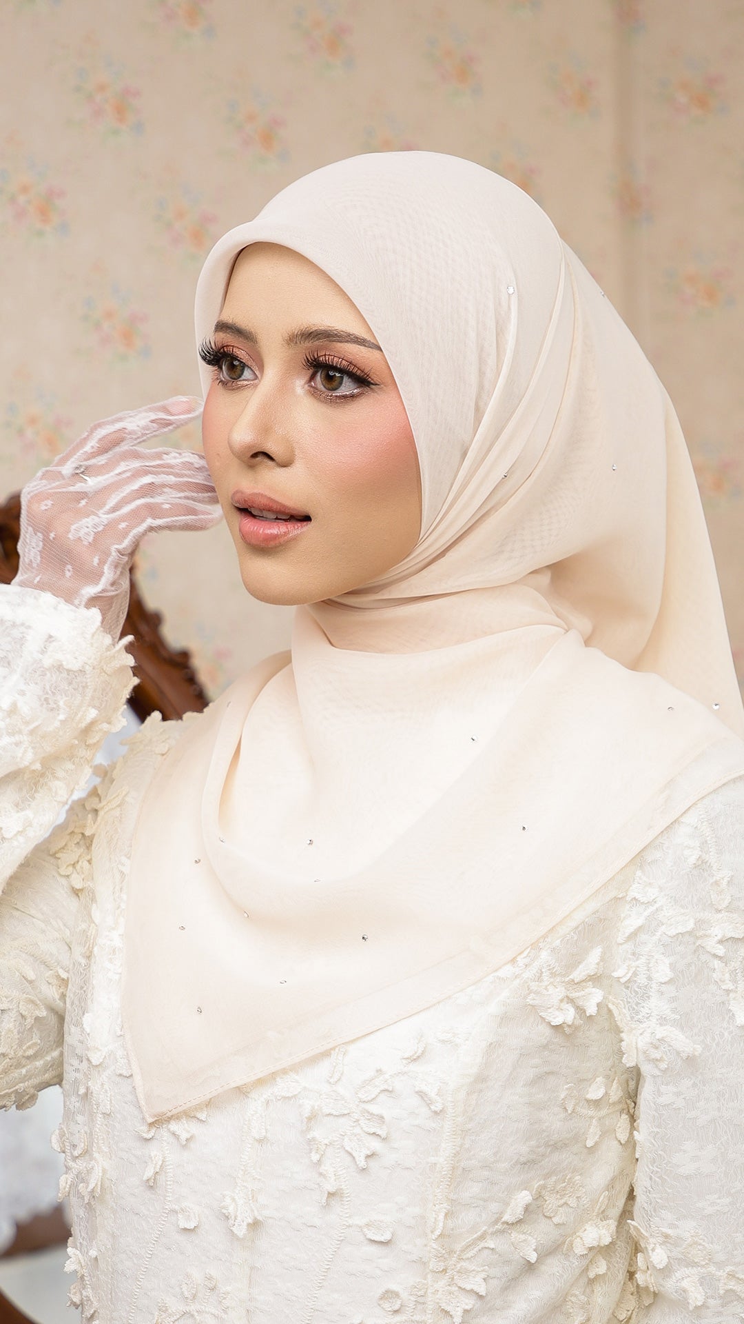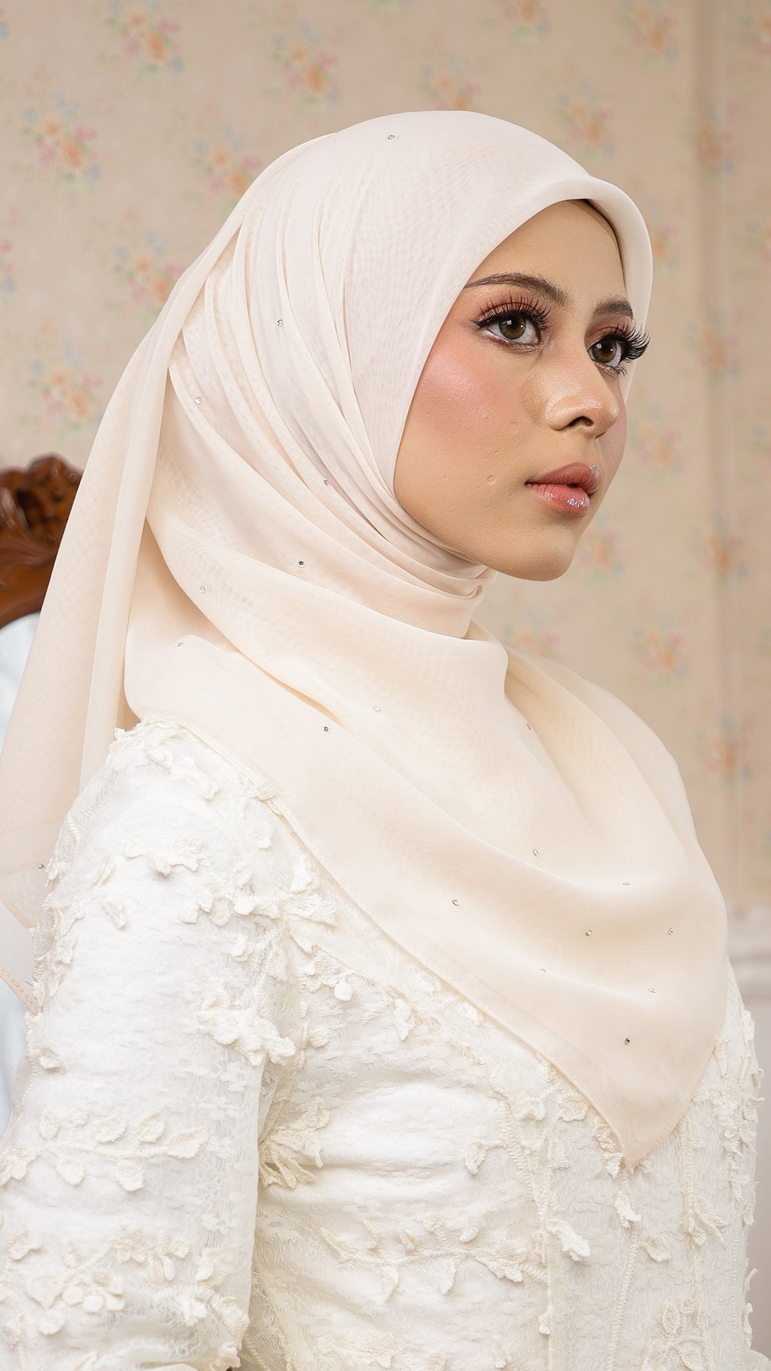 The Sofia Bawal represents a refined approach to contemporary hijab styling. This 45 x 45 inch square combines Japanese Voile a breathable, lightweight fabric prized for its fluid drape with authentic Swarovski crystals for subtle luminosity. With a 7/10 opacity rating, it delivers substantial coverage without compromising comfort or visibility.