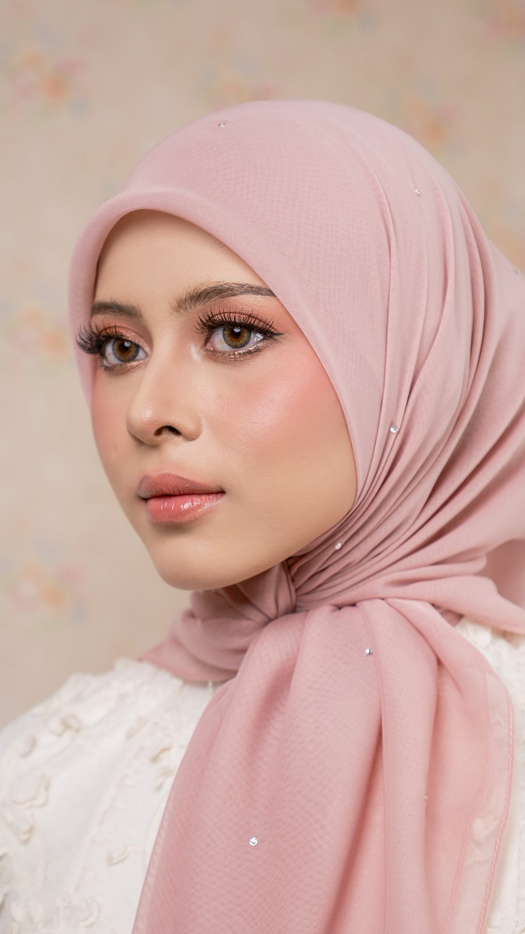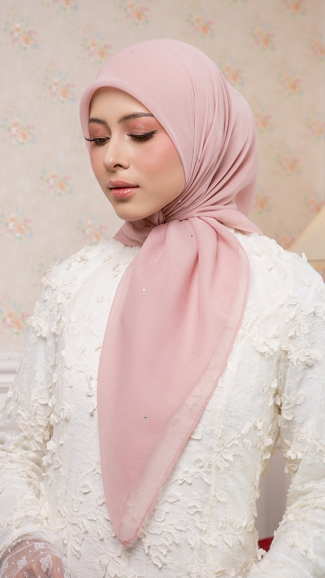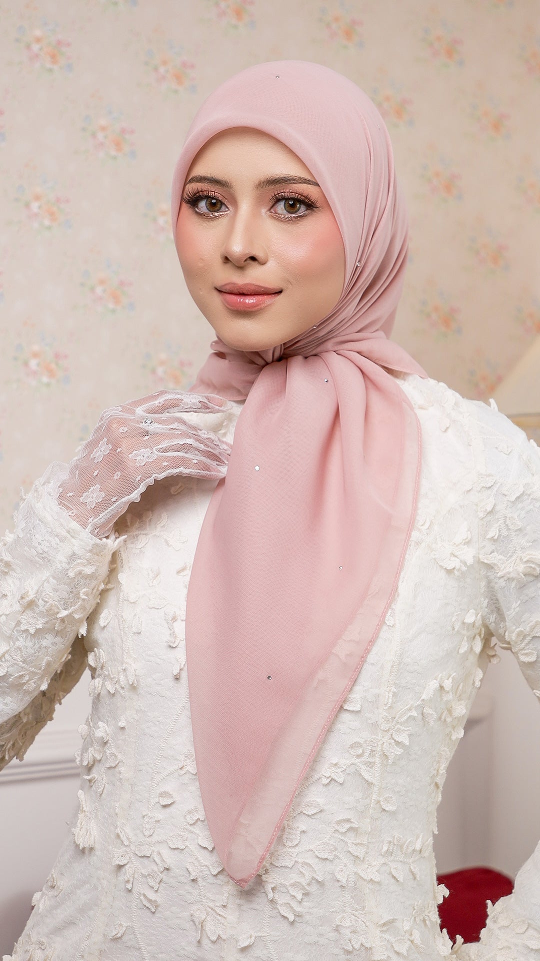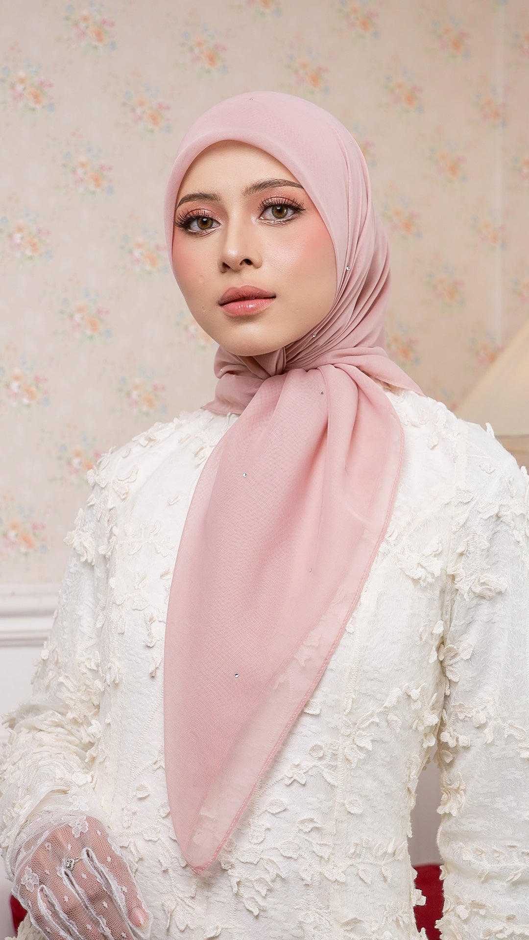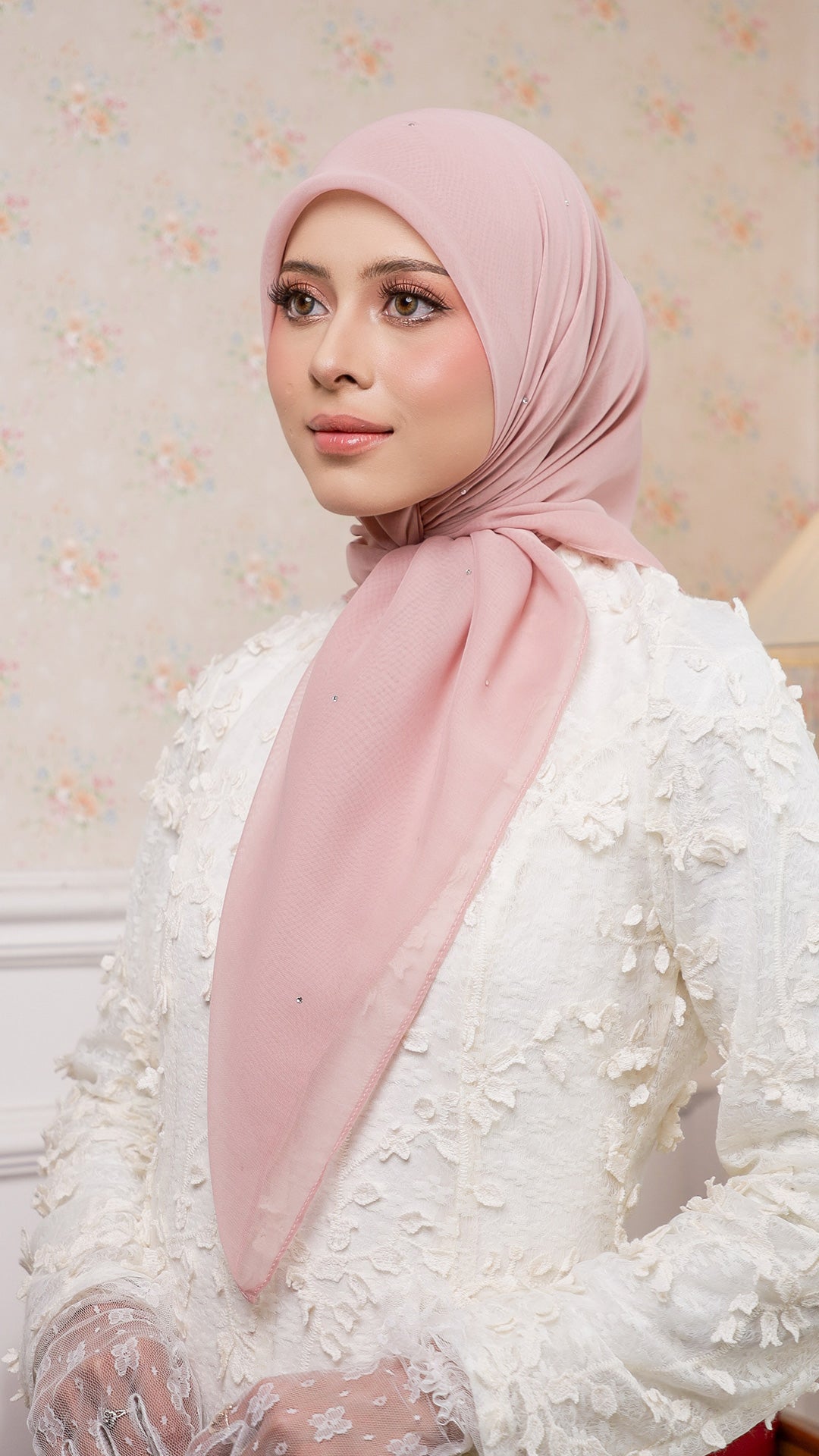 The Sofia Bawal represents a refined approach to contemporary hijab styling. This 45 x 45 inch square combines Japanese Voile a breathable, lightweight fabric prized for its fluid drape with authentic Swarovski crystals for subtle luminosity. With a 7/10 opacity rating, it delivers substantial coverage without compromising comfort or visibility.